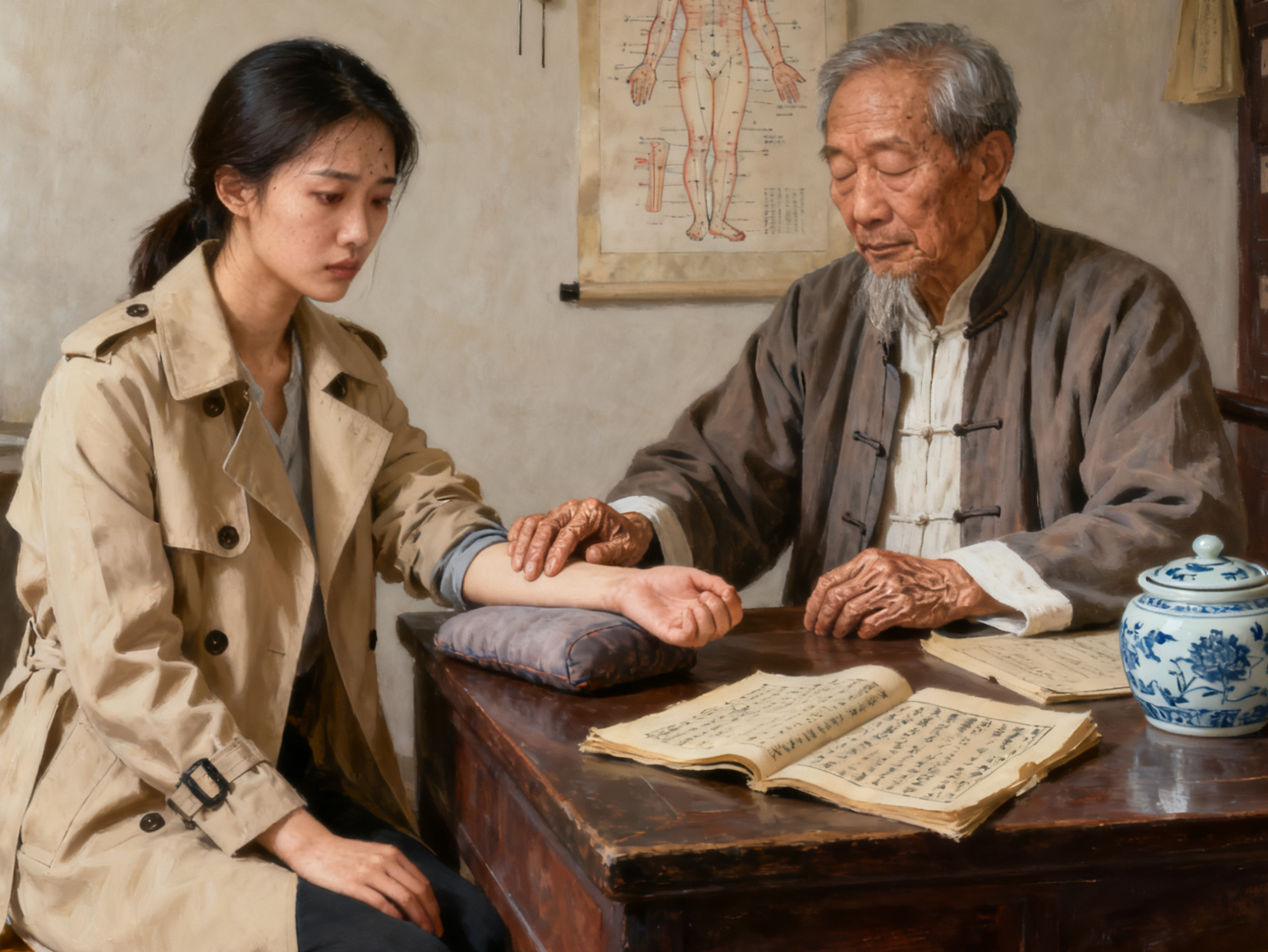 她顺从地走到八仙桌旁坐下,按照老人的示意,将自己的右手手腕,轻轻地放在了一个包裹着蓝色布面的脉枕上。
